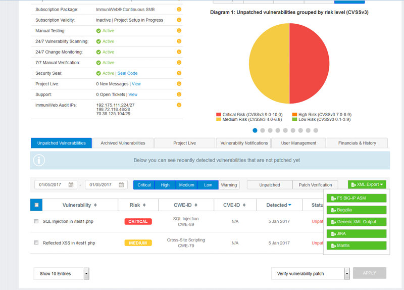 3.2 For ImmuniWeb Continuous projects, at any time when there are any vulnerabilities in “Unpatched Vulnerabilities” or “Archived Vulnerabilities” tabs of the dashboard, you can download XML file with the vulnerabilities in F5 BIG-IP ASM® for any vulnerabilities from the tab selected by risk level, detection date, type, or status as displayed on the screenshot below:
