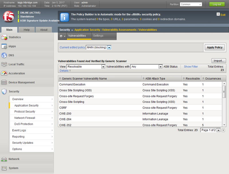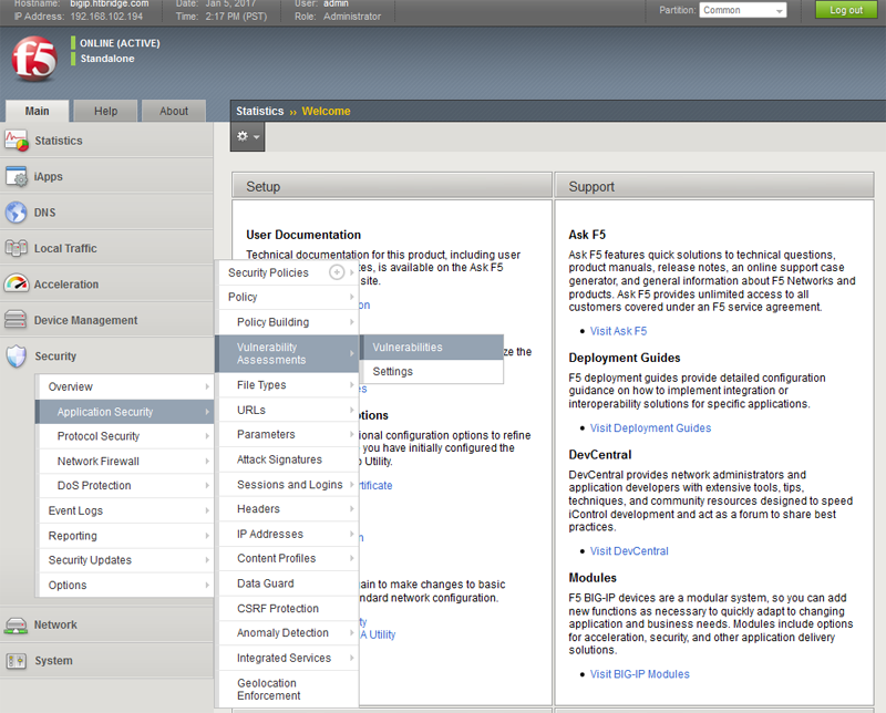 4) Login to the F5 BIG-IP Application Security Manager Configuration Utility. In the left-side menu go to: Security -> Application Security -> Vulnerability Assessments ->Vulnerabilities: