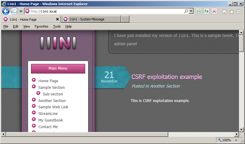After successful exploitation of the vulnerability a new articles named "CSRF exploitation example" will appear on the main page of the website: